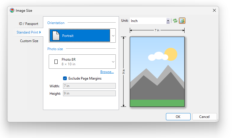 Tip: When printing 8×10 photos, use the Crop Image tool in ImagePrint to adjust the framing before printing. Click on the image, then press the crop Crop Image button on the context toolbar. The 8×10 inch size is also available as a standard size in the Image size dialog. Select one or more photos, and press the image resize Resize button to open the dialog. The go to the Standard Print tab, and select 8×10 from the Photo size dropdown. Make sure that Excude Page Margins is unchecked.